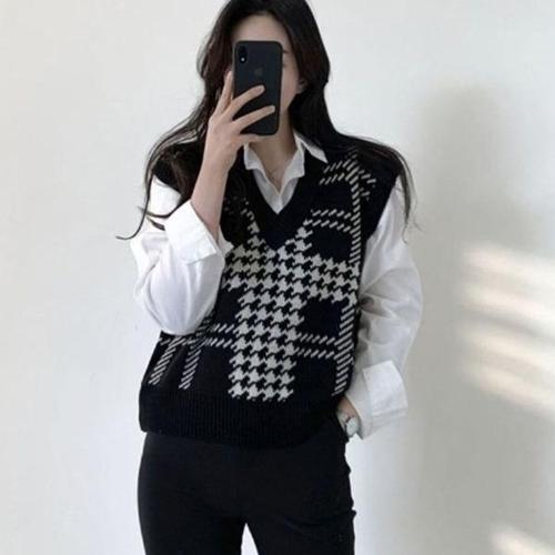 [엄지척]체크 여성 니트 조끼 여자 브이넥 크롭 니트 베스트_19682240_667501