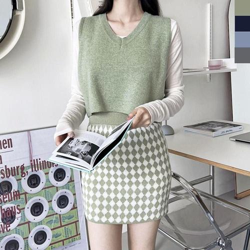 여자 스퀘어 브이넥 크롭 레이어드 니트 조끼 베스트-WFHTFNO