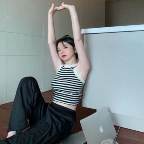 [셀럽하우스]여성 DWKY5297 홀터넥 스트라이프 크롭탑 민소매티 이너나시티