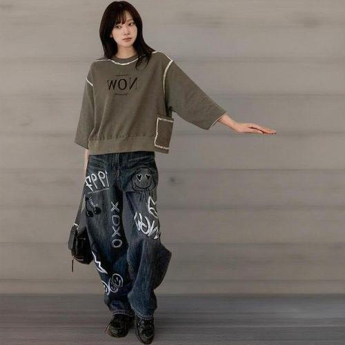 [신상오픈런]여성 크롭 루즈핏 맨투맨 키치무드 레터링 디자인