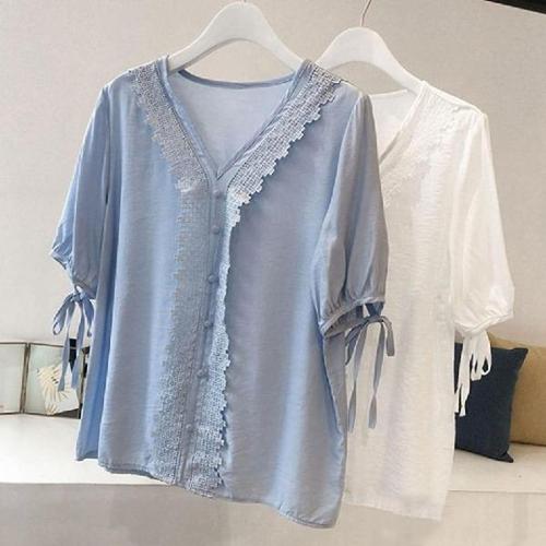 [신상오픈런]여성용 여름 리본 장식 퍼프 소매 크롭 블라우스