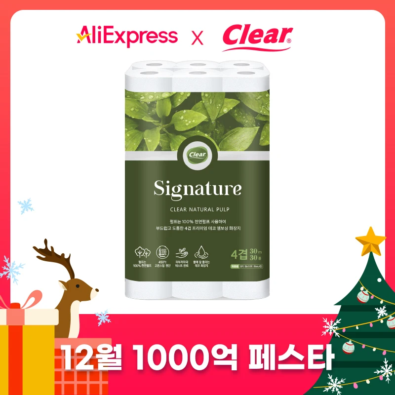 클리어 시그니처 화장지 부드러운 4겹 30m 30롤 100% 천연펄프 휴지 두루마리 무형광 무포름알데히드