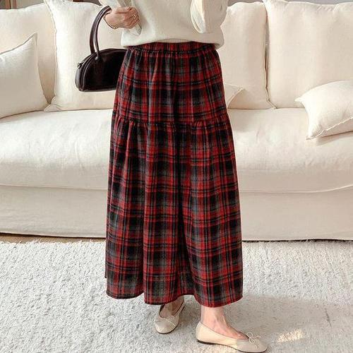 [다잇템_패션]여자 큰사이즈 타탄체크 티어드 롱스커트