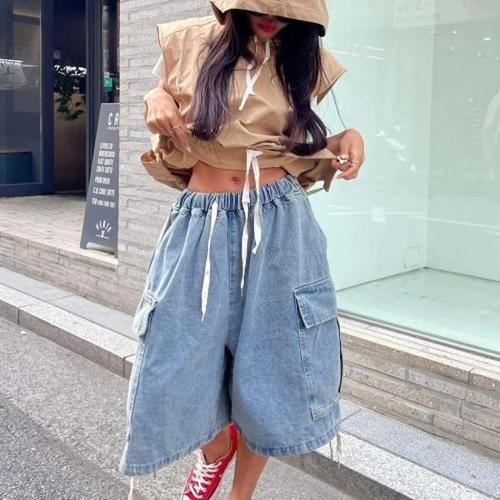 제로시아 여성용 5부 와이드 청반바지 스판 밴딩 빅사이즈