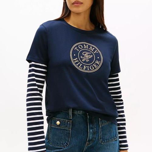 [해외배송] 타미 여성 엠브로이더 메돌이언 로고 티셔츠 Navy