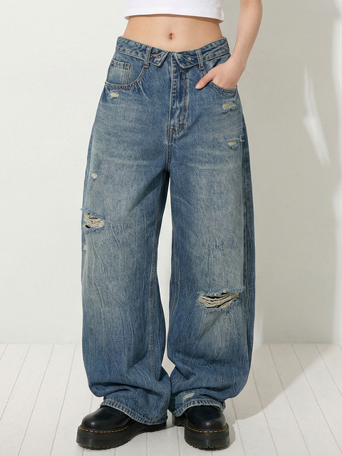 [탑걸] 폴드 데미지 워싱 데님 팬츠_T611DE402