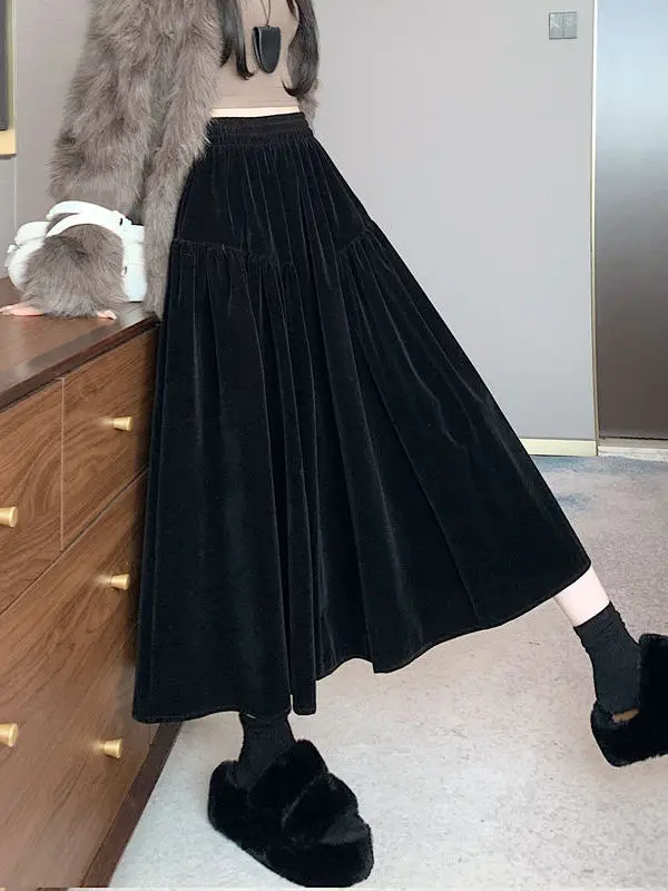 플러스 사이즈 여성용 블랙 벨벳 하이 웨이스트 미디 스커트 A라인 디자인 봄 가을 겨울 패션 트렌드 힙 커버 스커트
