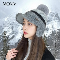 모니브 배색 여성 겨울 골프모자 귀달이 토끼털 방한 니트, 1개, 그레이