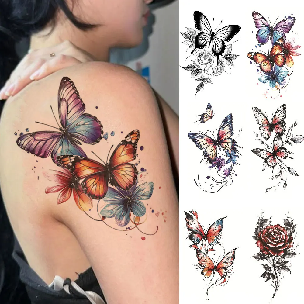 꽃무늬 방수 임시 타투 스티커 화려한 나비 장미 꽃 바디 아트 팔 가짜 타투 슬리브 여성 남성 손 허벅지