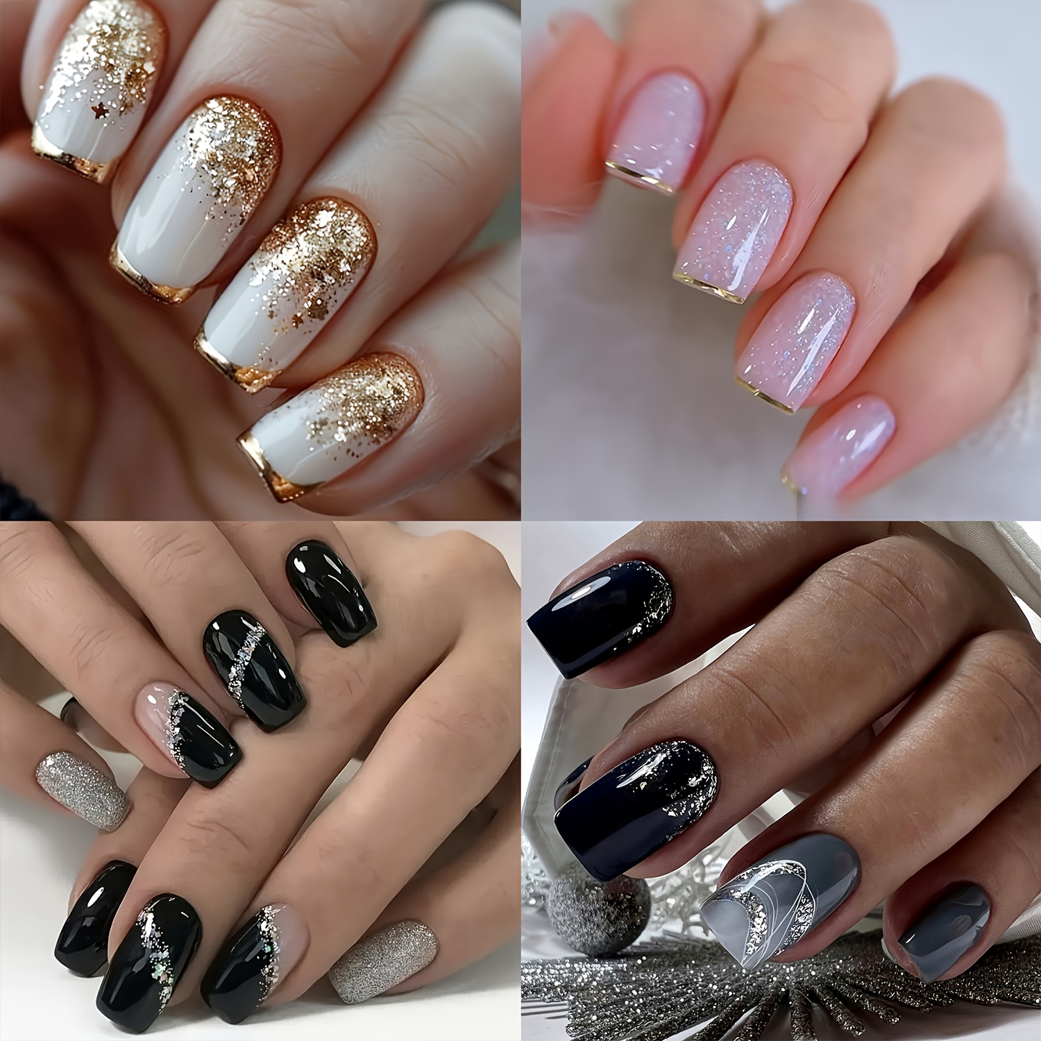 TEMU 96개 중간 크기 사각형 인조 손톱 세트. 블랙 & 그레이 그라데이션 글리터와 불규칙한 라인이 혼합된 컬러, 핑크 펄과 골드 프렌치 팁이 특징입니다.|네일팁
