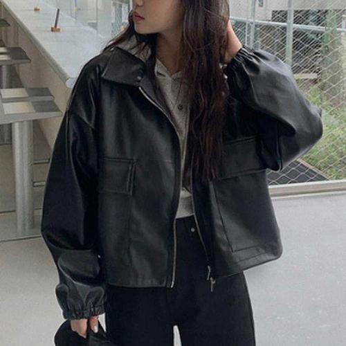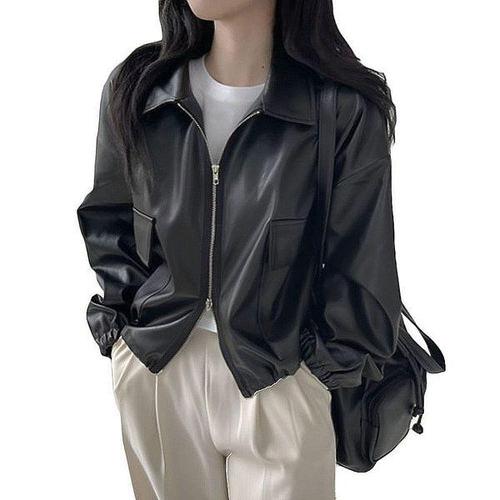 [에이치플러스몰]봄가을 투웨이 집업 블랙 가죽자켓 시보리소매 캐주얼