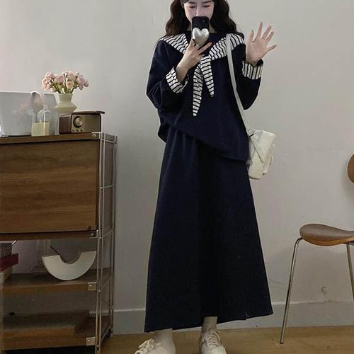 FANSYLI 빅사이즈 트레이닝복 스커트 세트 가을 겨울 여성 신상 레이어드 맨투맨+롱 A라인 스커트 투피스 캐주얼 맨투맨 세트 간절기 트레이닝복 세트 W2510O17