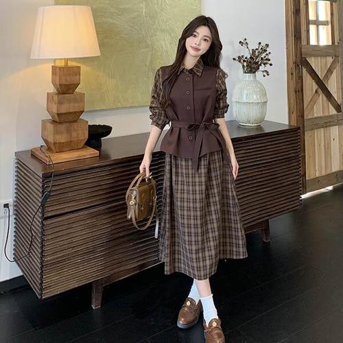 [유야]밑단 스트링 카라 셔츠 밴딩 롱스커트 세트 투피스 셋업 -SST0108H- 빅사이즈 루즈핏 여성 가을