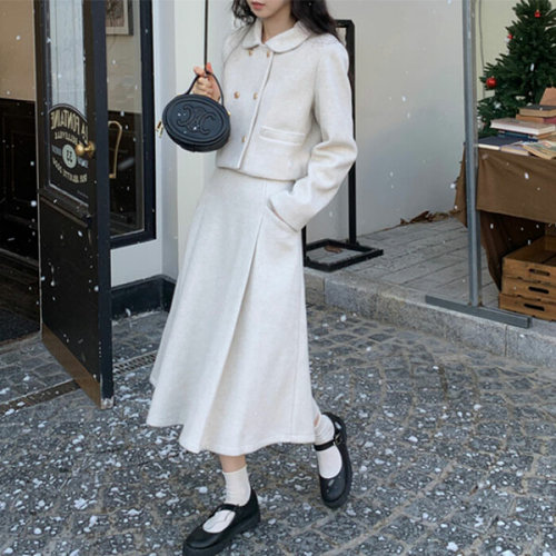 겨울 투피스 세트 모직 치마 셋업 하객룩 크롭 재킷 플리츠 여성 데일리 그레이 롱 스커트