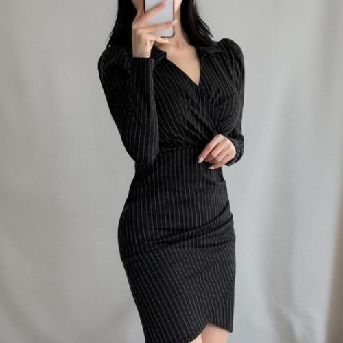 [미라클세븐]여성 브이넥 카라 스트라이프 튤립 원피스