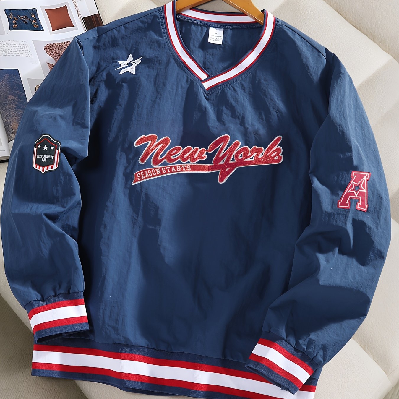 TEMU 트렌디한 남성용 V넥 풀오버 디자인 스웨트셔츠, 슬림핏, 대학 운동복 스타일, 편안한 커뮤터 스웨트셔츠, 레터 패치 패턴, 대조 컬러 리브드 칼라