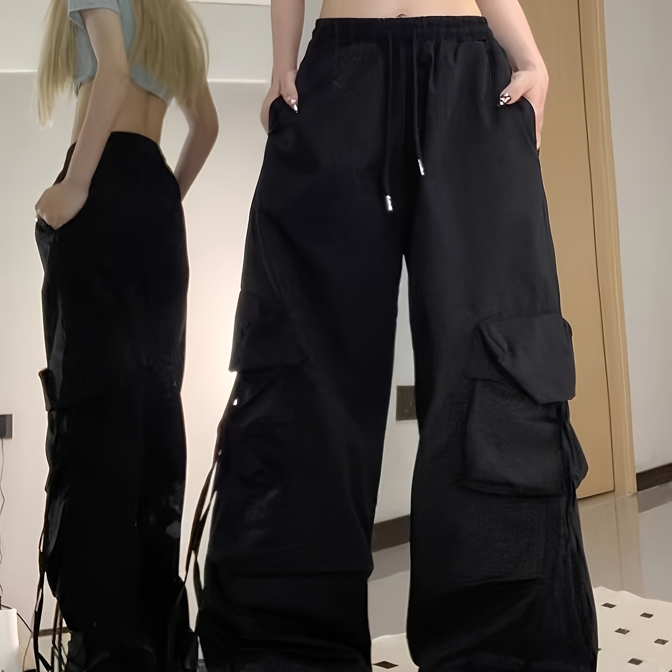 TEMU 여성 캐주얼 긴 바지, 스트리트 댄스 루즈핏 와이드 레그 트라우저, 탄성 허리 밴드 디자인, 세탁기 사용 가능한 오피스 캐주얼 바지, 하이웨이스트 여성 트라우저, 포켓 디자인, 여성 블랙 긴 바지