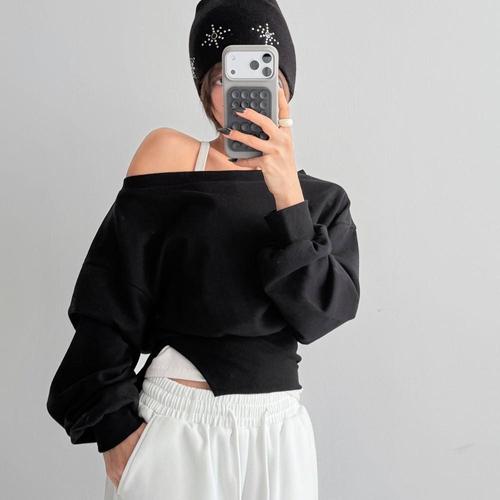 옷자락 / 여자 오프숄더 무채색 크롭 밑트임 슬림 봄 맨투맨