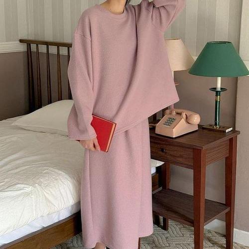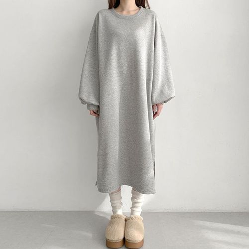 에르디테 / 겨울 기모 퍼프 맨투맨 미디 옆트임 데일리 오버핏 롱 원피스 3컬러