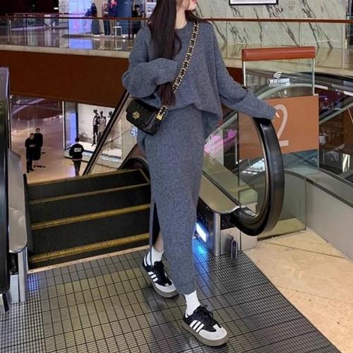 [신상오픈런]여성 오버사이즈 니트 롱스커트 트임 세트 골지 디자인