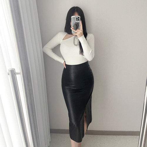 글램핏 / S-L 하이웨스트 레더 가죽 H라인 미디 트임 롱 스커트 2컬러