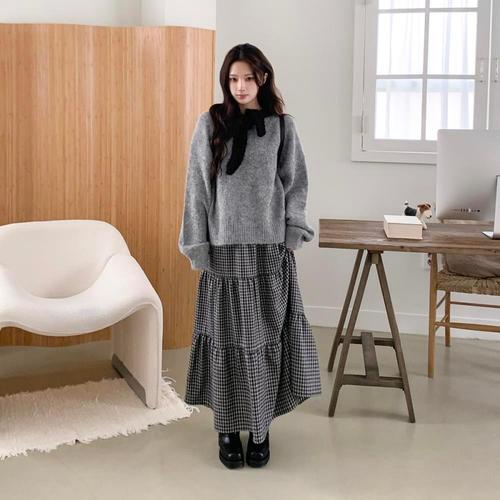[다잇템]여성용 티어드 프릴 격자 콘트라스트 롱스커트