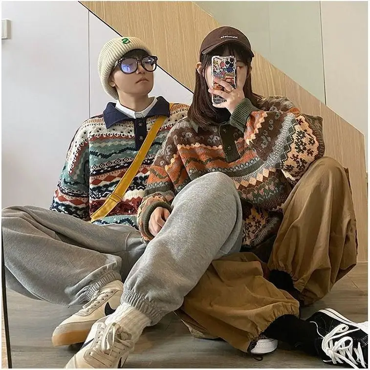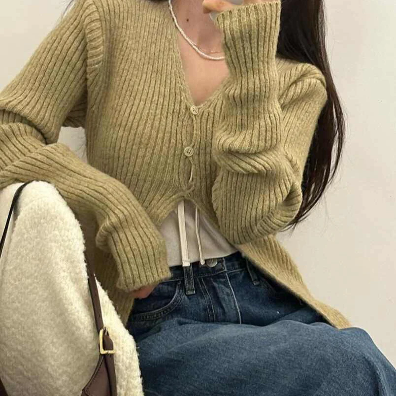 빈티지 버튼업 니트웨어 스웨터 부드럽고 편안한 여유로운 스타일 여성 가을 패션 캐주얼 루즈핏 긴팔 폴리에스터 섬유