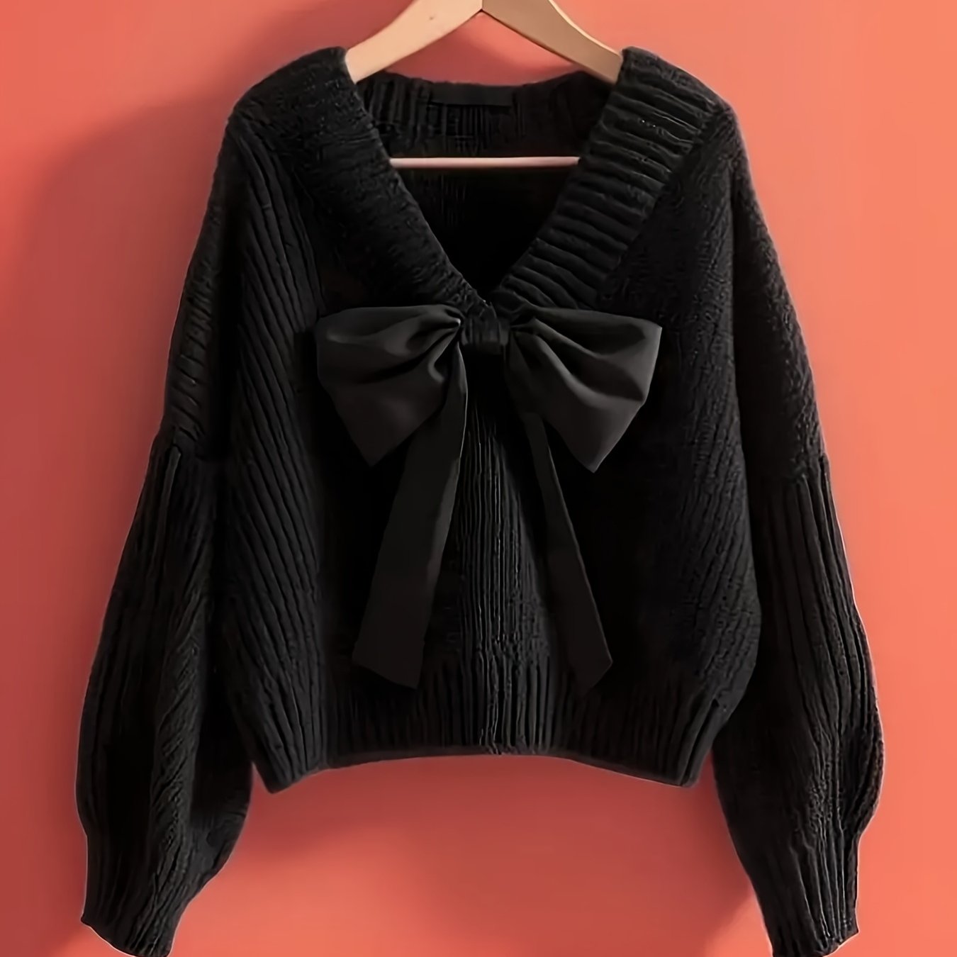 TEMU 여성용 우아한 V넥 리본 장식 스웨터 - 겨울용 따뜻한 루즈핏 고탄력 블라우스, 솔리드 블랙 가을/겨울 웨딩 크리스마스 파티 의상 (스페셜 라인 컬렉션)