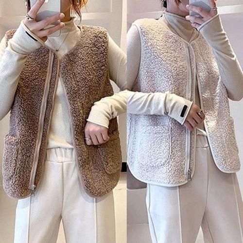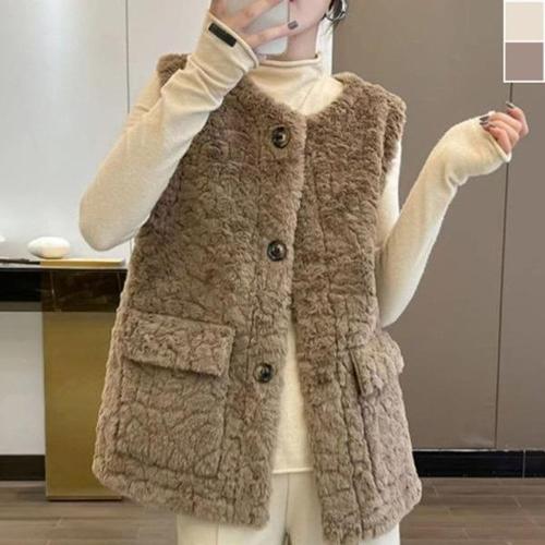[옷자락]여성 루즈핏 따뜻한 퍼 양털 라운드넥 버튼 포켓 조끼