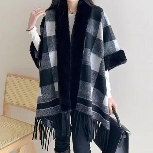 겨울 여성 후드 케이프 코트 여성용 루스핏 롱케이프 페이크 퍼 트리밍 프린지 디테일 LCL