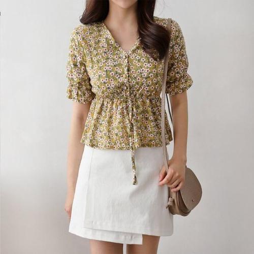여성 여름 하객 플라워 스트링 브이넥 퍼프 블라우스