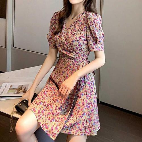 플라워패턴 랩원피스 스트링 A스커트라인 퍼프소매