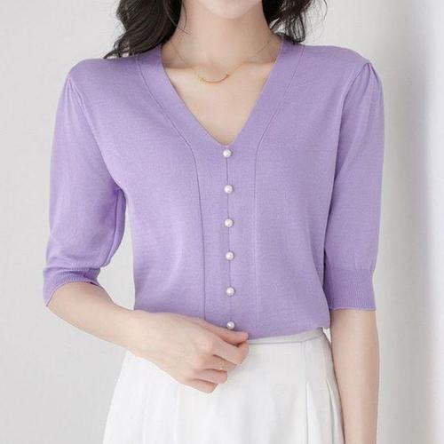 [에이치플러스몰]여성 여름 썸머 브이넥 반팔 니트 티 퍼플