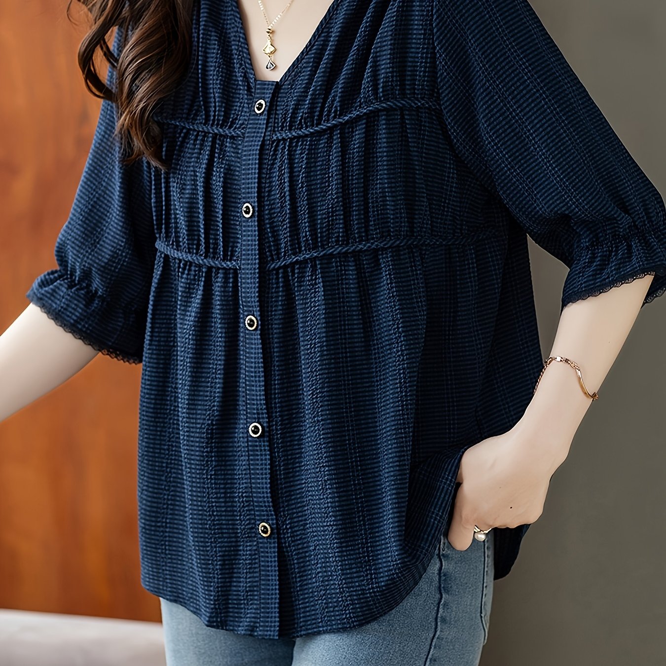 TEMU 플러스 사이즈, 주름 디자인 V넥 2025 여름 신상 미드슬리브 셔츠 한국식 캐주얼 다용도 여성 상의