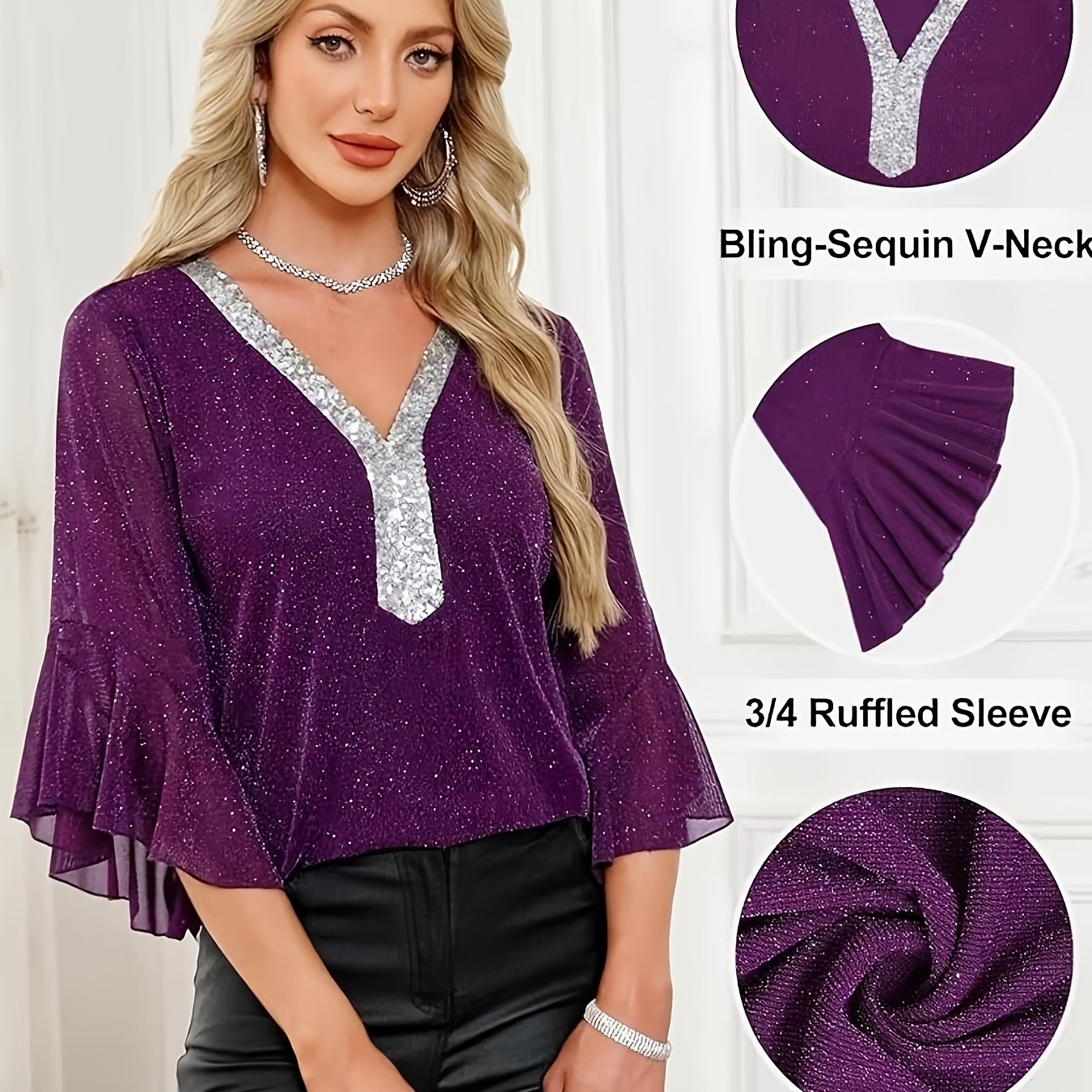 TEMU V넥 블라우스, 우아한 3/4 소매 레이스업 커프 탑, 봄 & 가을 여성 의류