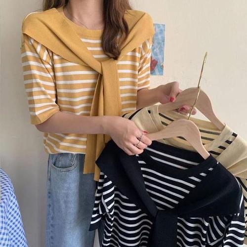 [셀러허브_여성트랜드패션]ONM 페이크룩 숄가디건 레이어드 스트라이프 반팔 니트