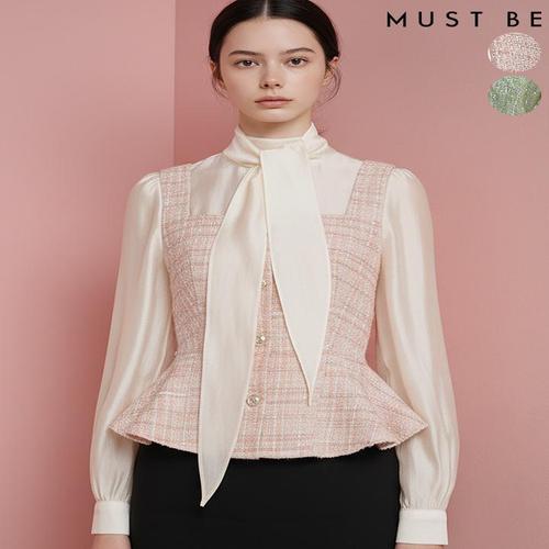 [머스트비]여성 페플럼 트위드 타이 블라우스
