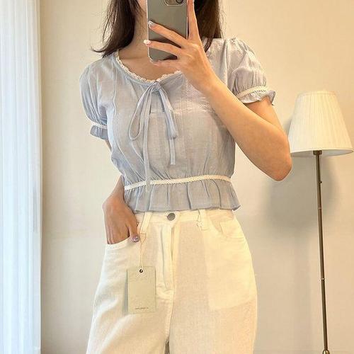 [옷자락]여성 배색 레이스 리본 핀턱 페플럼 크롭 블라우스