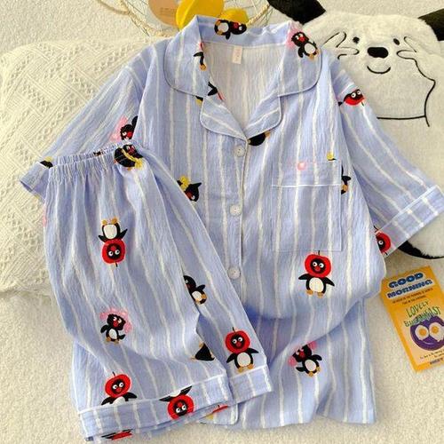 TEMU 여성 여름 얇은 반팔 반바지 만화 펭귄 귀엽고 사랑스러운 여름 외출복 집복 세트 투피스 라펠 잠옷 세트 반팔 반바지 귀여운 집복 외출복으로도 입기 좋음