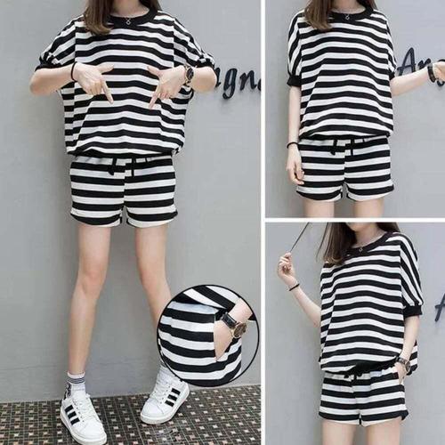 [셀럽하우스]여성 OFZY8479 라운드넥 스트라이프 편한밴딩 반팔 반바지 세트