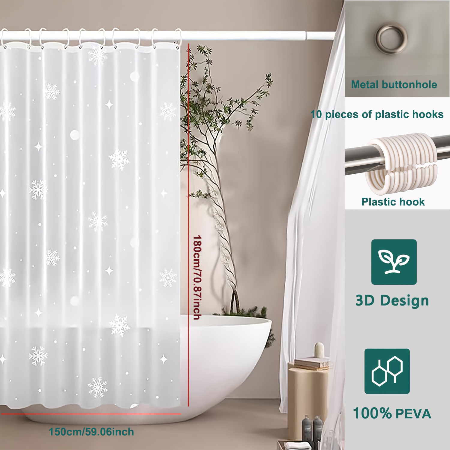TEMU 1개 두꺼운 패턴 샤워 커튼, 투명 샤워 커튼 라이너, 욕실 사생활 보호 커튼, 후크 포함 욕실 추가 장식, 욕실 장식, 크리스마스 용품|샤워커튼