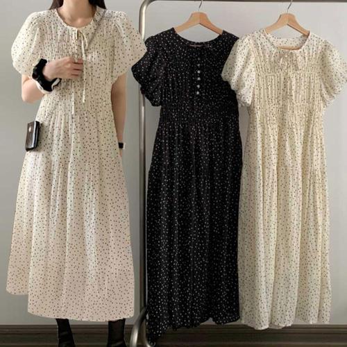 [옷자락]여자 폴리 도트 퍼프소매 루즈핏 미디원피스