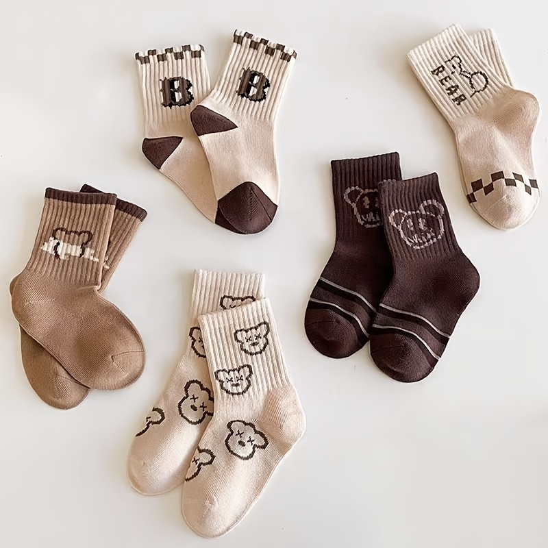 TEMU 겨울용 따뜻한 곰 발바닥 & 이니셜 패턴 소프트 미들 캐프 부티 5켤레 세트 - 크리스마스, 생일 선물 및 캐주얼 의상용 (갈색/베이지/핑크)