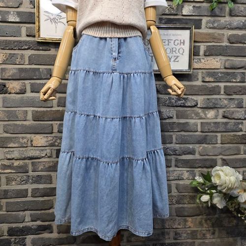 퐁당 / 층층 플레어 밴딩 청 데님 스커트