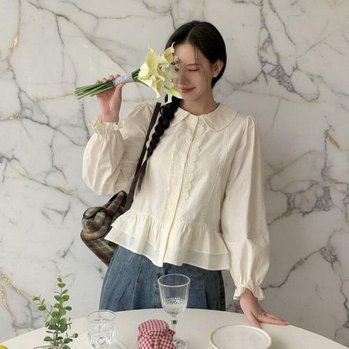 [미라클세븐]여성용 봄 시즌 사랑스러운 둥근 카라 프릴 레이스 플레어 셔츠
