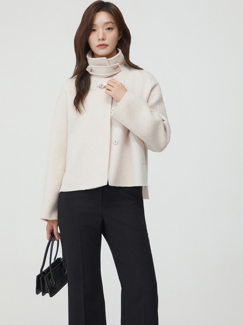 [다잇템] 여성 무스탕 폴라넥 힙무드 스트랩 버클 자켓