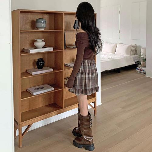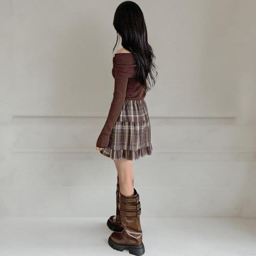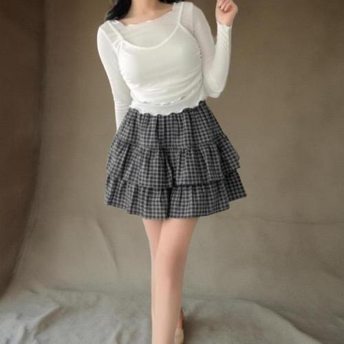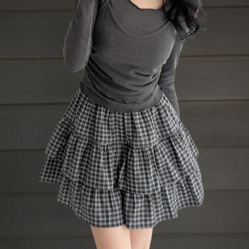 [옷자락]여성 사랑스러운 배색 체크 프릴 플레어 미니 치마