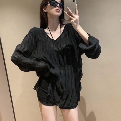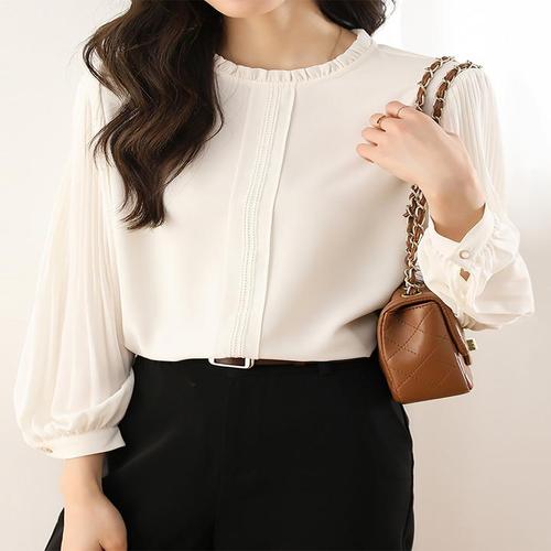 여성 2컬러 시스루 트임 플리츠 긴팔 쉬폰 블라우스 WFJ2E8Q