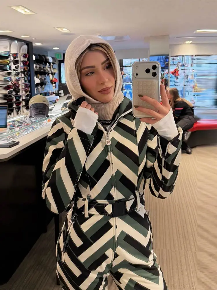 여성용 스타일리시한 배색 스트라이프 후드 스노우 스포츠웨어 캐주얼 방수 스키 점프수트 2026 우아한 따뜻한 스키 팬츠 아우터웨어
