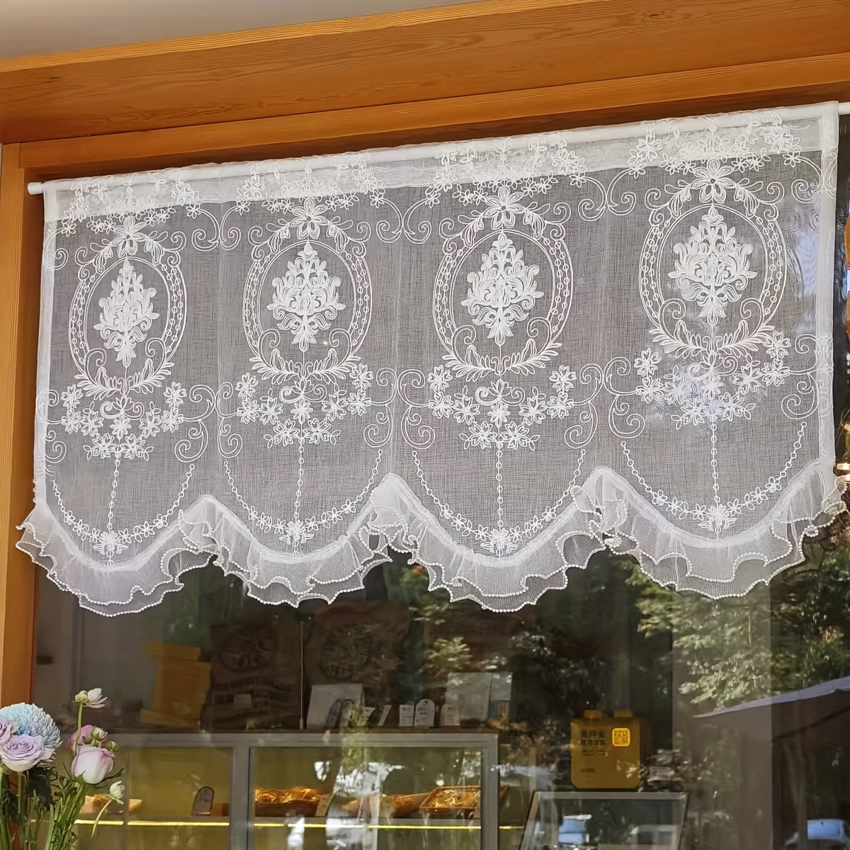 TEMU 1pc 현대 꽃 자수 투명 커튼 발란스 - 주름 있는 가장자리, 반투명 폴리에스테르 블렌드, 기계 세척 가능, 다양한 방 유형에 적합, 진주 가장자리 장식